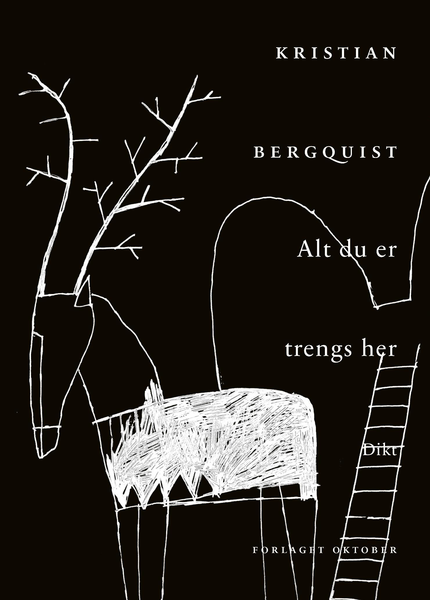 jeg tenker at et selvmord ikke skjer ut av det blå men ut av det svarte I Kristian Bergquists niende diktsamling "Alt du er trengs her" finner det sted en samtale om ensomhet og dødsdrift i et mildt, ujålete og henvendt språk. Diktene sprer varme, som en solstorm i kosmos. Kjærlighetslengselen er stor, meningsløsheten større, men ved tilbaketrekningen poeten selv gjør, bort fra menneskene, inn i skogen og litteraturen, finner han slektskap. Hjorten er en sky skikkelse, atomkraftverket i barndomsbyen lekker, norske hverdagshelter klager ikke og relativitetsteorien kan forklare så mangt.