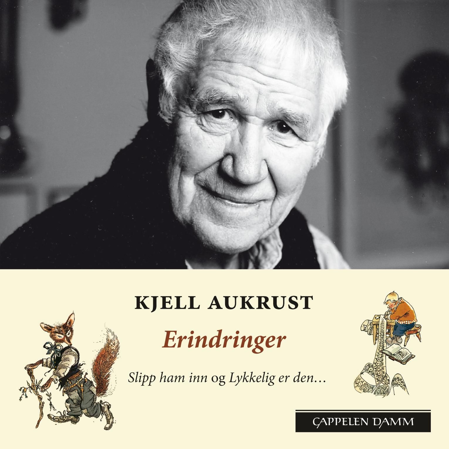 Erindringer er en samleutgave som består av Kjell Aukrusts Lykkelig er den og Slipp ham inn. Aukrust deler her sine erindringer fra fødselen i Alvdal i 1920, til lykkelige dager i Italia femti år senere. Erindringer er et sprudlende oppkomme av minner, historier og situasjoner. Det er unike refleksjoner formidlet med Aukrusts helt spesielle fortellerglede.