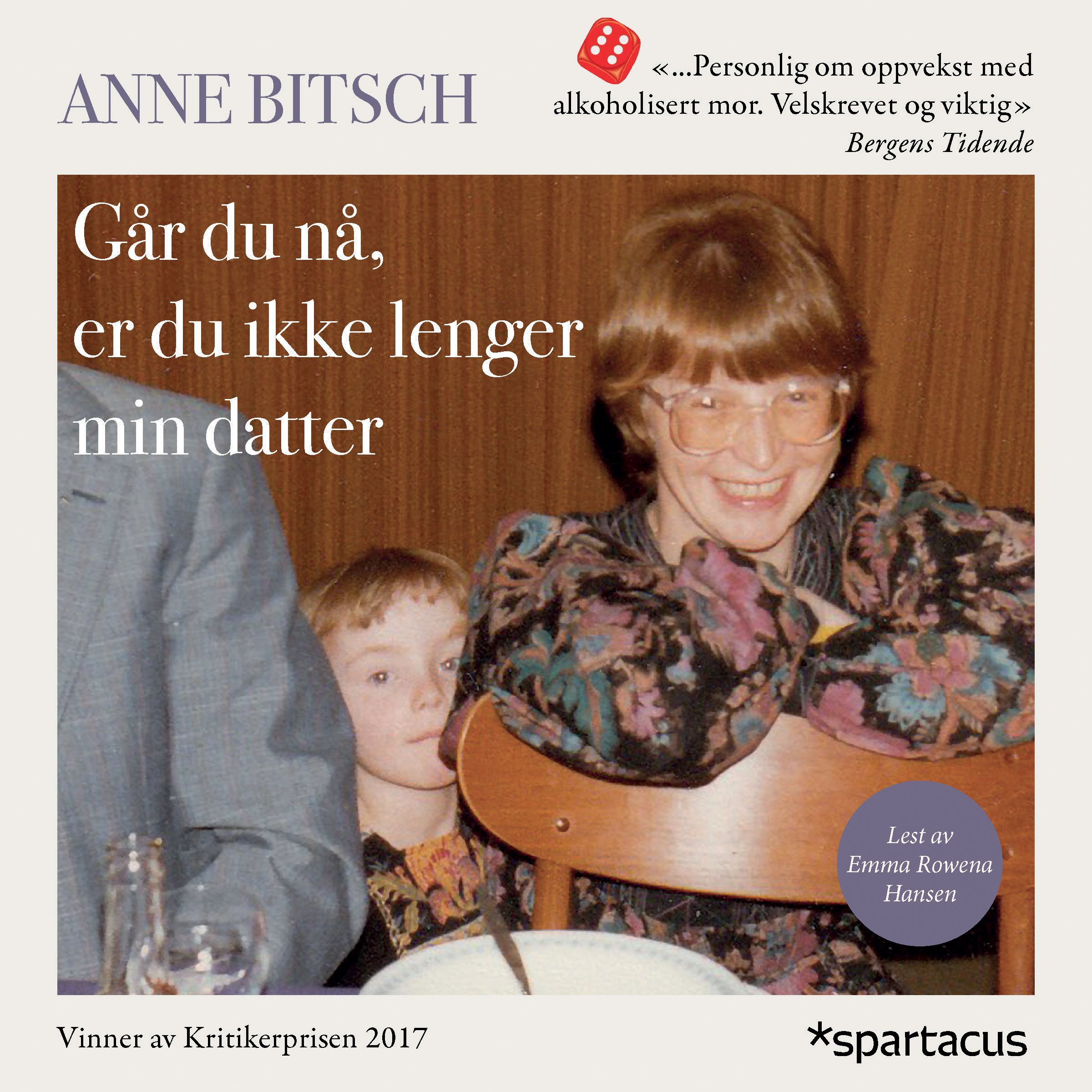 «Anne Bitschs selvbiografi om å vokse opp med en alkoholisert mor bringer fokuset tilbake til barnets opplevelse. Portrettet av oppveksten er nådeløst, simpelthen i kraft av å beskrive hverdagen for et barn uten trygghet, emosjonell og fysisk stabilitet. Bitschs samfunnsperspektiv og utvidede metode bidrar dessuten til å løfte boka til et mer analytisk nivå.»