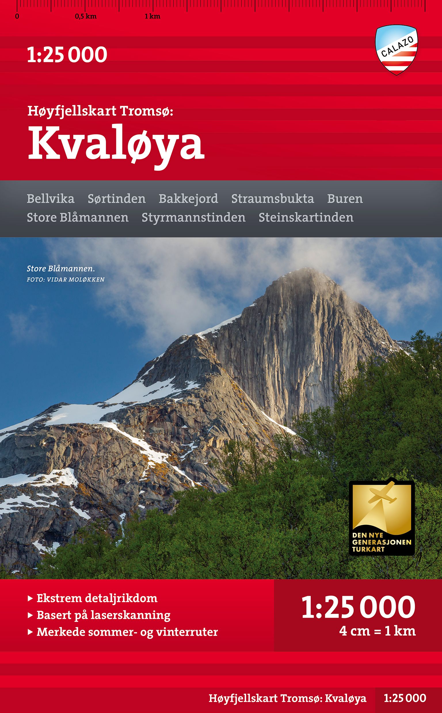 Dette er ett av to unike kart med en detaljrikdom som aldri tidligere er vist over .området rundt Tromsø. Terrenginformasjonen i kartet er basert på laserskanning fra fly. Fjellskrenter, vassdrag, breer og andre .naturelementer vises mye mer detaljert med denne teknologien.Et kart i målestokk 1:25.000 er nyttig for deg som planlegger en topptur til Tromsdalstinden (1238 moh), Hamperokken (1397 moh) eller Blåtinden (1190 moh).Kartet vil også kunne brukes av de som ønsker å forlate merkede stier for å utforske egne ruter i høyfjellet.