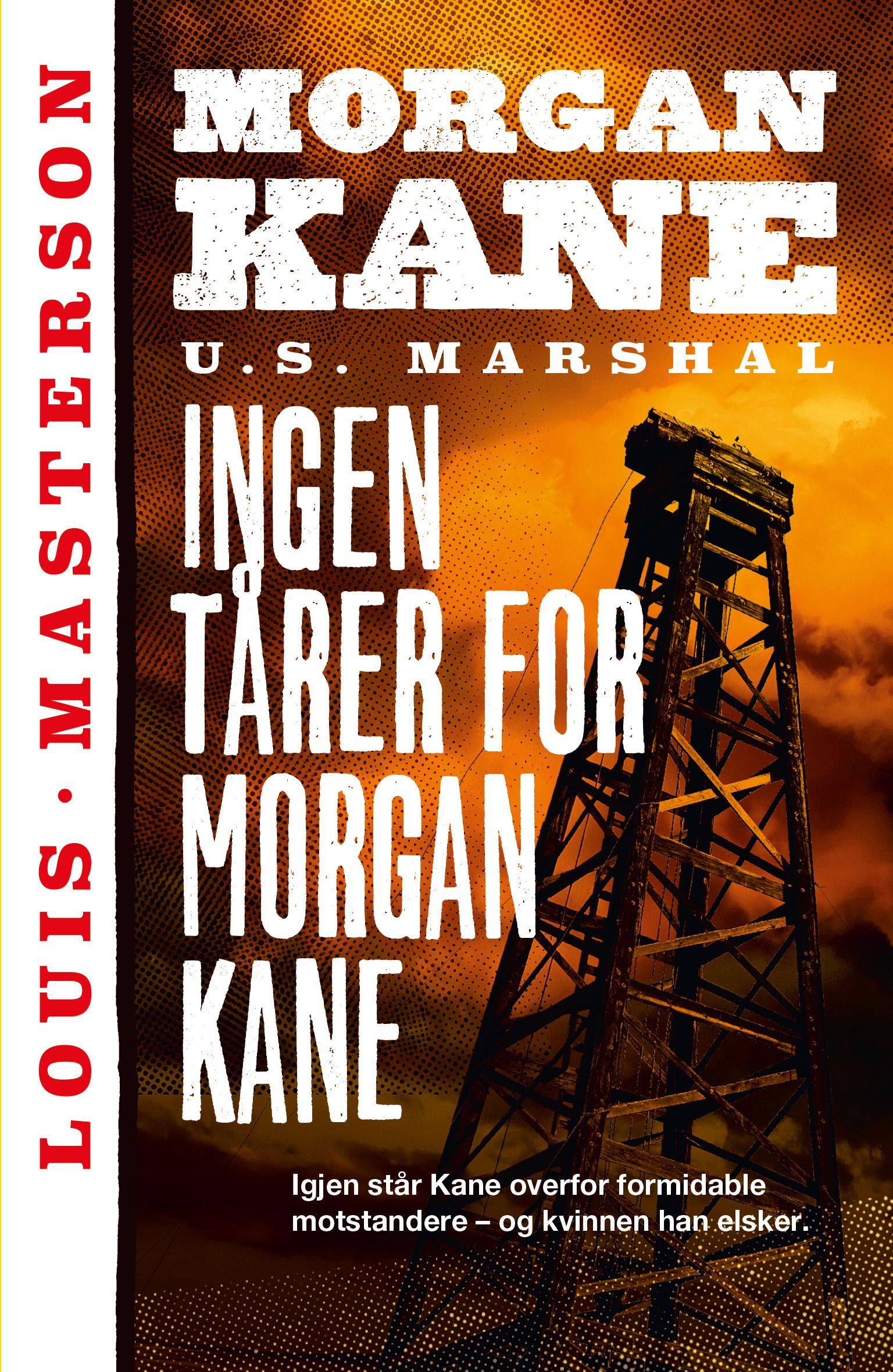 Han – Morgan Kane – orket ikke å ta et skritt mot henne. Med ett følte han en skjelvende frykt for at minnene skulle bli så levende at de slukte ham. For han kjente henne igjen. Å Gud, som han kjente henne igjen! Håret, det rødgylne håret, fregnene over neseryggen, den slanke skikkelsen.