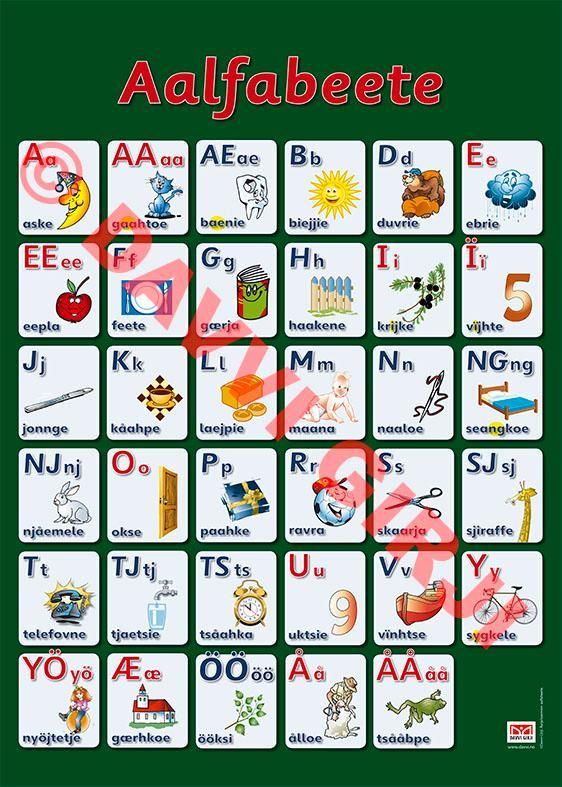 Stor plakat i A2 format med det nordsamiske alfabetet med illustrasjoner. Bør henge på veggen i enhver barnehage & småskoleklasse hvor det undervises i nordsamisk!